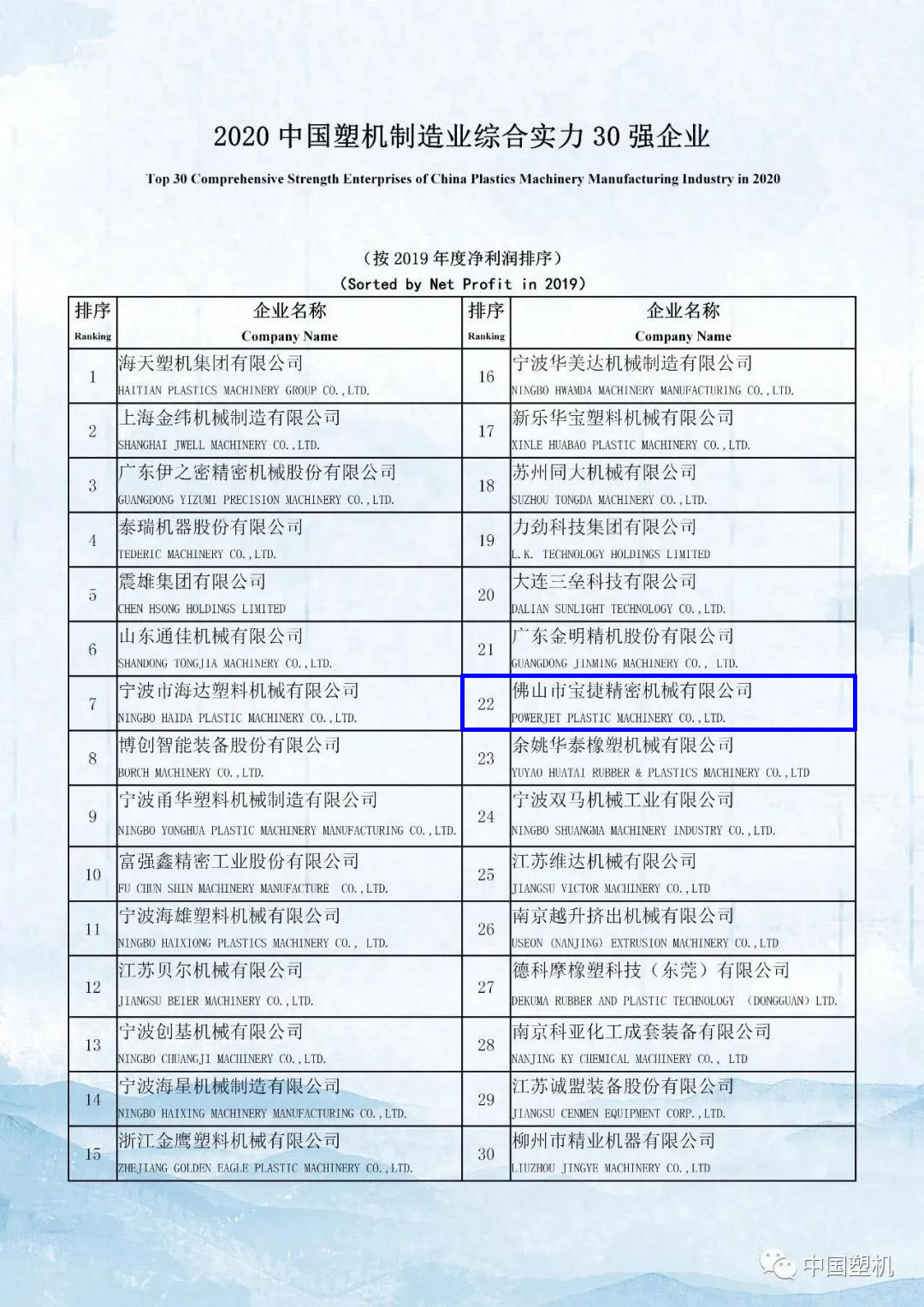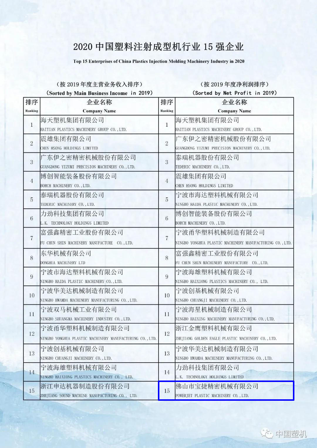由中国塑料机械工业协会组织的“2020中国塑机行业优势企业排序工作”(参见中塑机协〔2020〕14号文),本着“公平、公正、自愿”的原则,分别以“2019年度主营业务收入”和“2019年度净利润”为主要经济指标进行排序。根据各单位上报的2019年度资料,经相关部门审查和核实,确定出“2020中国塑机制造业综合实力30强企业”、“2020中国塑料注射成型机行业15强企业”、“2020中国塑料挤出成型机行业10强企业”、“2020中国塑料中空成型机行业5强企业”和“2020中国塑机辅机及配套件行业5强企业”入选名单。并于2020年8月3日~8月10日公示。