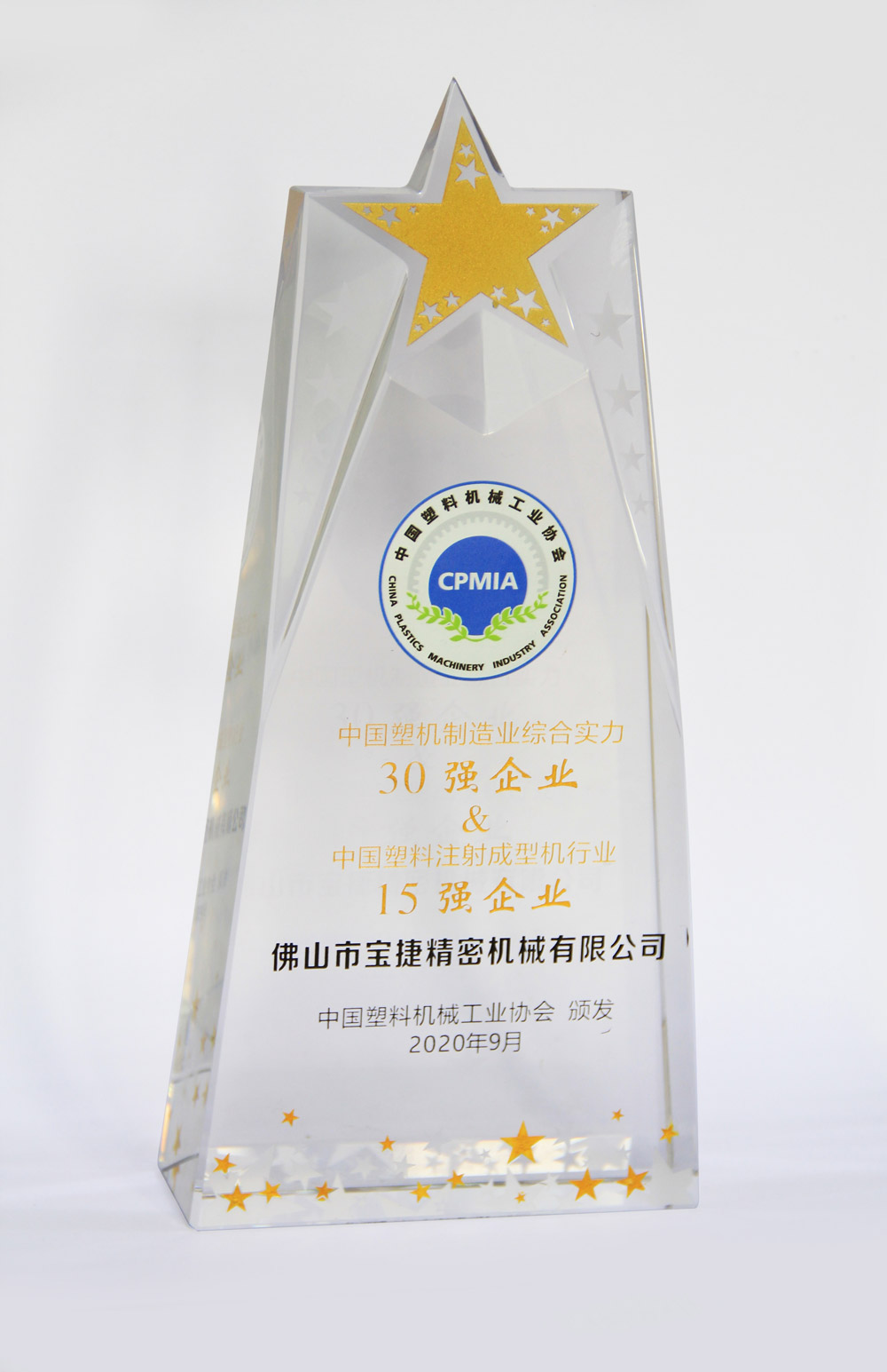 我司——佛山市宝捷精密机械有限公司被评为“中国塑机制造业综合实力30强企业”及“中国塑料注射成型机行业15强企业”。
