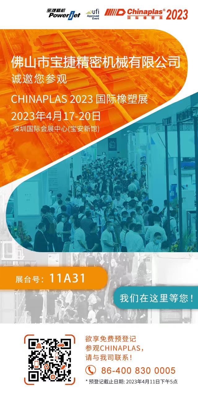 CHINAPLAS 2023国际橡塑展即将盛大开启,宝捷诚邀你莅临11A31展位参观交流!作为我司邀请的贵宾,您将获得“免费入场码”,可豁免RMB80元的入场费,请通过以下“免费门票领取方法”完成观众预登记手续。