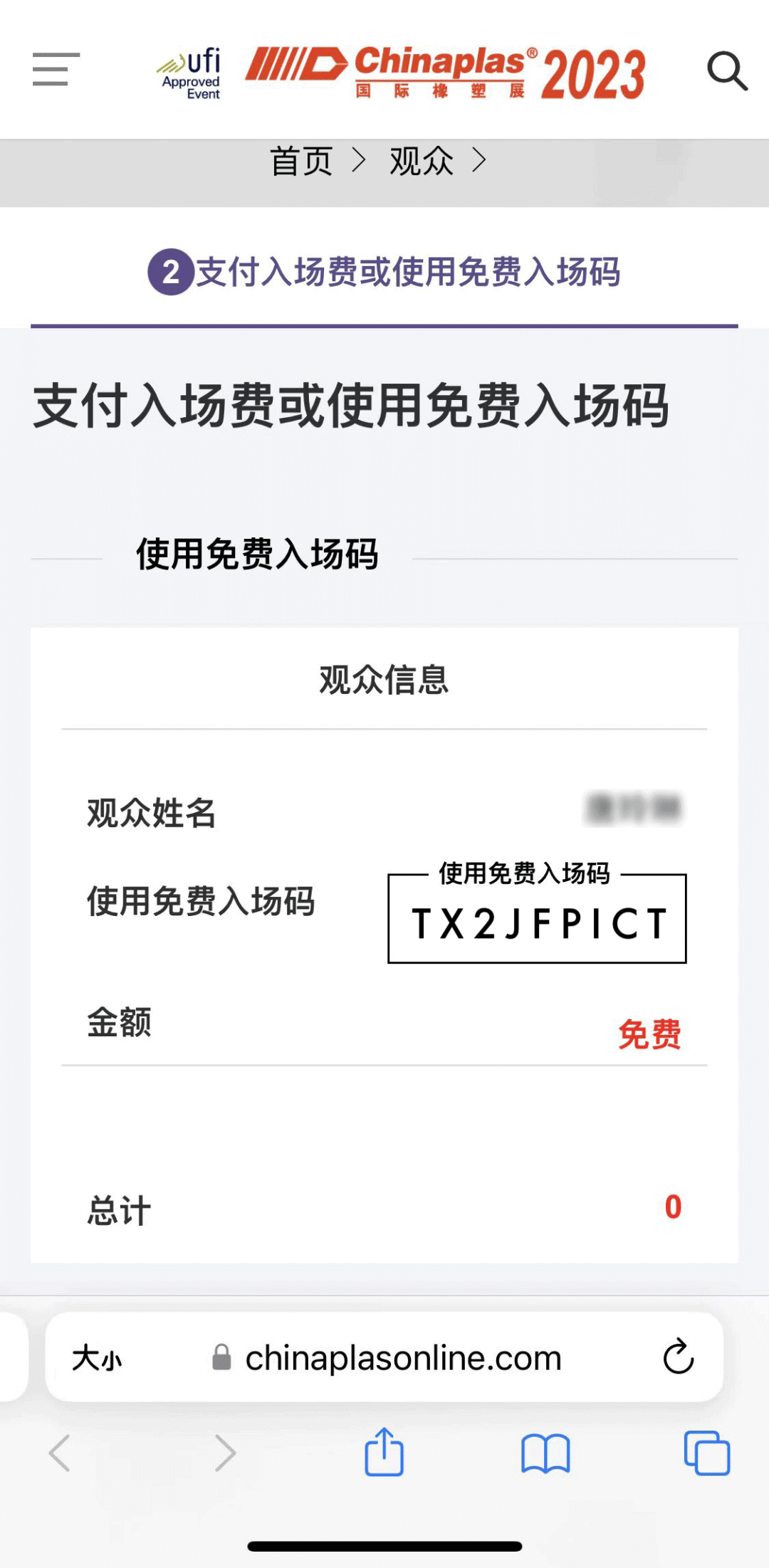 提交后,跳转至[支付入场费或使用免费入场码]页面,将复制的免费入场码——TX2JFPICT,粘贴至输入框中并提交。