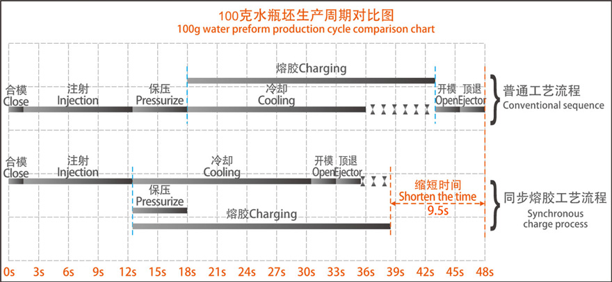 同步熔胶动作,缩短成型周期,提高效率。
