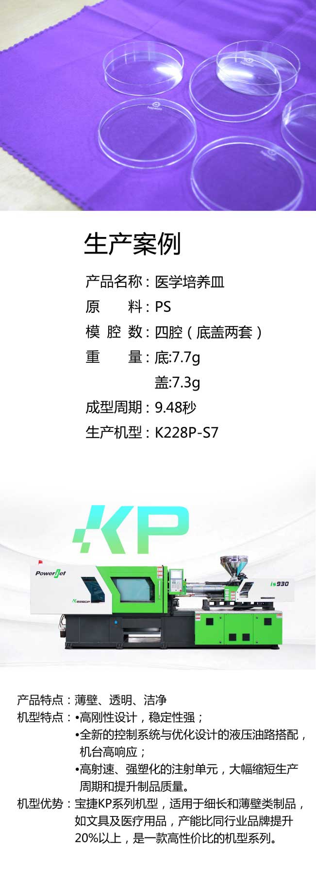 宝捷K228P-S7高精密注塑机,锁模力2280kN,机型节能稳定、快速高效,具有更快的注射和熔胶速度,更高的生产效率,适用于文具、医疗等多个行业。视频产品为医学培养皿,一模四腔(两底两盖),单个底重7.7g,单个盖重7.3g,周期为9.48秒,采用PS原料。制品薄壁、透明、洁净,尺寸稳定,成品率高。